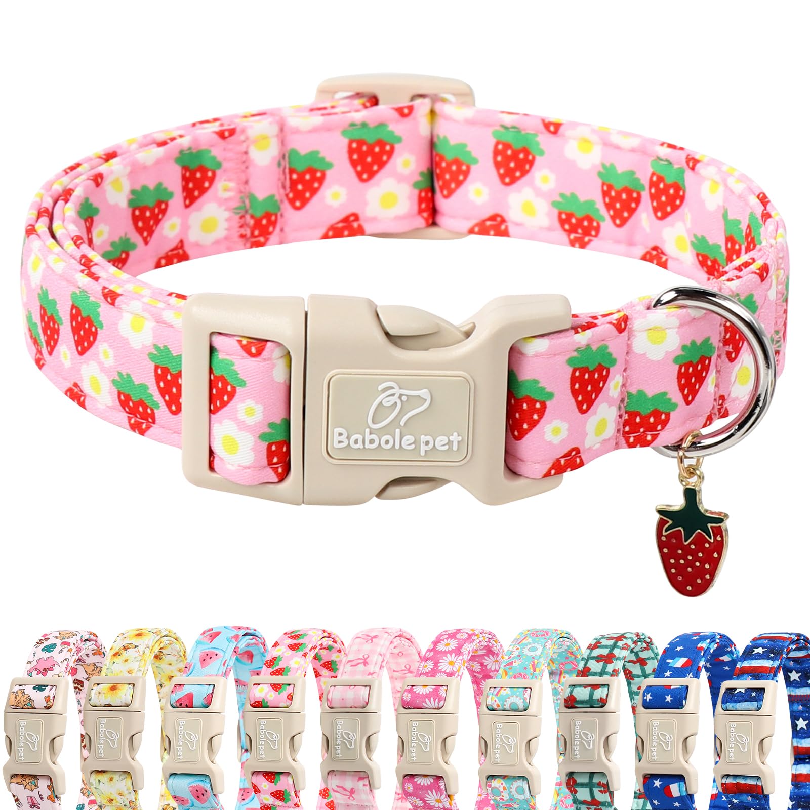 Babole Pet Cute Spring/Summer Dog Collar, Adjustable Pink Strawberry Dog Collars for Medium Dogs, Lightweight Quick-Release Buckle Collar for Boy&Girl|Pet Supplies