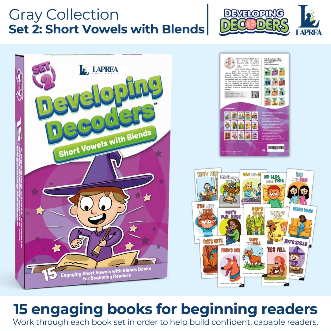 This decodable book set includes 15 full-color books with one to two short simple sentences per page that focus on short vowels, perfect for little hands to hold as children become more confident, independent readers. An activity guide and VIDEO LESSON is included to further encourage skill development. The books in this set have one to two sentences per page and include fun characters and engaging stories that keep students turning the pages. Every book has full-color, professional illustrations. In addition to the decodable books, this book set comes with a booklet of activities to reinforce crucial reading skills. Not sure where to start when it comes to helping your child, student, or learner with their reading skills? These book sets were developed in a systematic way so that children are building new skills while also reinforcing previously-learned skills as they read their way through the books in the set. When they are finished with the set, they can move onto the next book set, which includes a new level and progression of skills. These decodable readers are: Simple and easy-to-use. This set includes decodable books that introduce phonics skills in a specific order so beginning readers can build their skills. Engaging and fun. This beginning reader book set includes 15 full-color, professionally written and illustrated stories that will engage children ages 4-7. Developed by educational professionals. The books have been professionally leveled by Lexile, and the activities have been designed by professional educators. You get more than books. In addition to the 15 decodable books, a small booklet of activities is included that focuses on improving comprehension, fluency, and critical thinking. This set is part of a larger collection called the Gray Collection that includes twelve book sets. Search to find each listing within Amazon. Set 1: Short Vowels, -s | Set 2: Short Vowels with Blends, -ff, -ll, -ss, -zz | Set 3: Short Vowels with Digraphs ck, sh, ch | Set 4: Short Vowel Review with Digraphs | Set 5: Glued Sounds, Beginning Blends | Set 6: Final Blends, Three-Letter Blends, Affixes | Set 7: Long Vowels with Final Silent e, Soft c, Soft g | Set 8: Vowel Teams | Set 9: Vowel Teams | Set 10: R-Controlled Vowels, Multisyllabic Words | Set 11: Diphthongs, y as a Vowel | Set 12: Phonics Review. decodable books for beginning readers Phonics books for early readers Phonics readers Book set for kids Kindergarten books for reading
