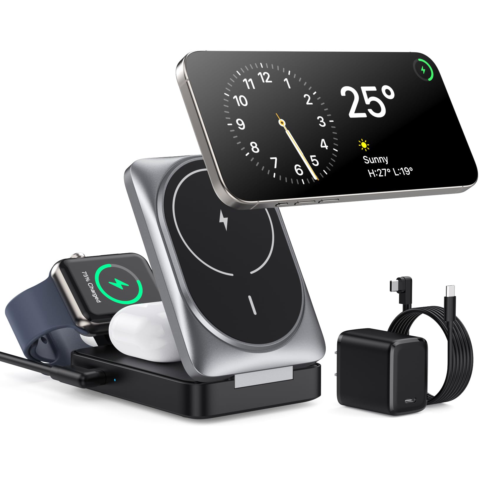 【Wireless Charger for MagSafe/iPhone/ Apple Watch/ AirPods】Wireless magnetic portable charger compatible with MagSafe magnetic case, compatible with iPhone 16/ 16 Plus/ 16 Pro/ 16 Pro Max/iPhone 15/ 15 Plus/ 15 Pro/ 15 Pro Max/ 14/ 14 Plus/ 14 Pro/ 14 Pro Max/ 13/ 13 mini/ 13 Pro/ 13 Pro Max/ 12/ 12 mini/ 12 Pro/ 12 Pro Max, Apple Watch 9/8/7/6/5/4/3/2/Ultra 2/Ultra 1/SE, AirPods 3/2 Pro 2/Pro. (Note: Please use Mag-Safe phone case or without case for wireless charging) 【Foldable Design, Magnetic Charger Stand】 The Foldable Magnetic 3-in-1 Wireless Charger features a simple and convenient design, Charge multiple devices at once, including your iPhone, AirPods, and Apple Watch, All while enjoying the versatility of the built-in adjustable stand. This feature reduces cable clutter and simplifies your charging routine. This charger is exceptionally well-suited for travel. (Note: For optimal charging, use the provided 30W USB-C PD wall charger.) 【30W Fast Charging Adapter】The 30W adapter improves charging by 50% over the other adapters. High power chipset smartly distributes ultimate charging solutions to fully charge your iPhone, iWatch and Airpods in 1.5 hours at the same time. Just snap to provide safe and reliable wireless charging. Unlock the power of high-speed 15W charging, backed by certification. Put your iPhone onto the device horizontally or vertically to get it charged instantly. 【Upgrade Powerful Mag-Safe Charger Stand】Mag-Safe charger 3 in 1 makes fast charging safe and easy. The built-in super strong magnet makes alignment instantly and precisely, just 1 second to achieve lightning fast wireless charging. The magnetic charger can hold your iPhone horizontally and vertically, or in any directions, the phone charging area can adjust the angle up and down by 65°, you can enjoy all your comfortable viewing from any angle.