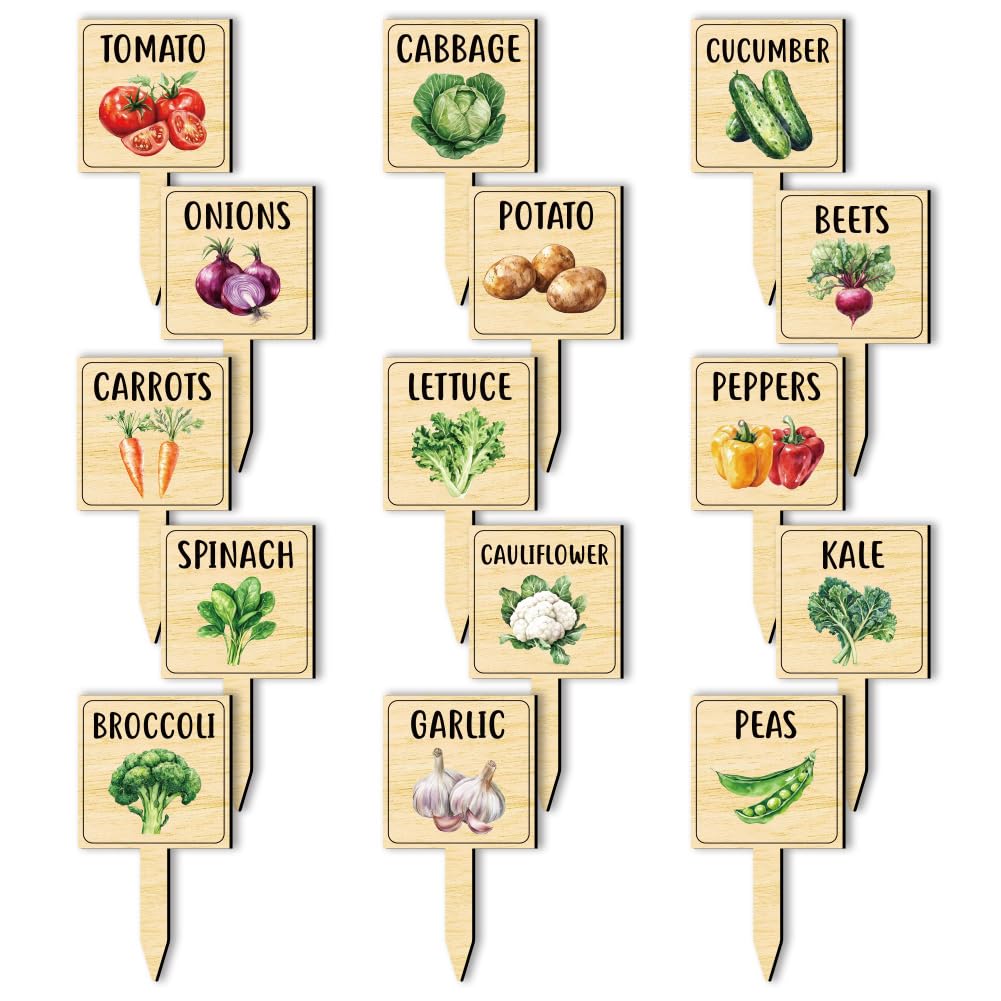 arricraft 15 Pcs Watercolor Vegetable Plant Labels, Wooden Markers T Type Tags Garden Labels with Printed Pattern Wood Garden Stakes for Indoor and|Lawn & Garden
