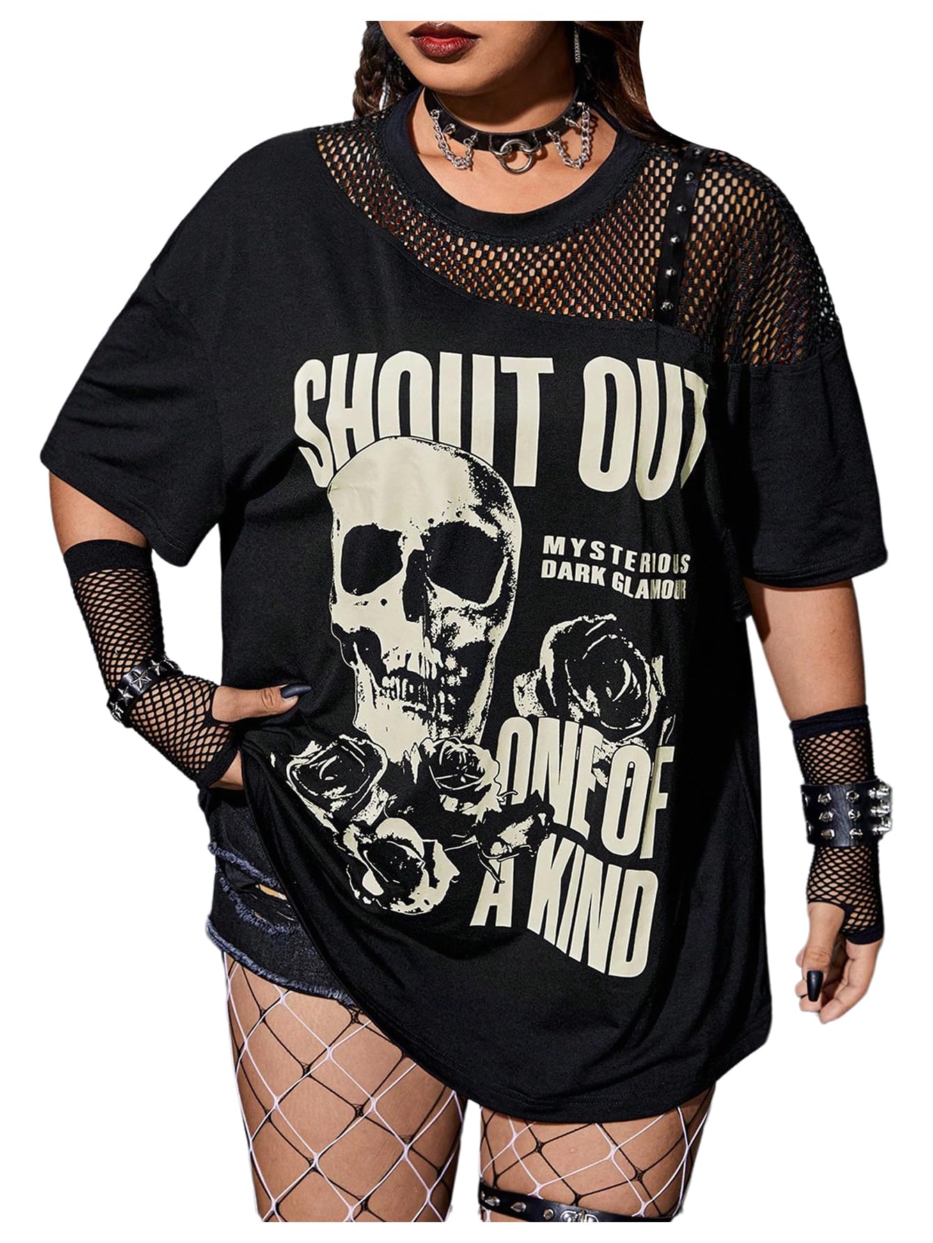 Verdusa Women's Plus Size Skull Letter Mesh Tees Y2k Punk Studded Half Sleeve T Shirt|Clothing