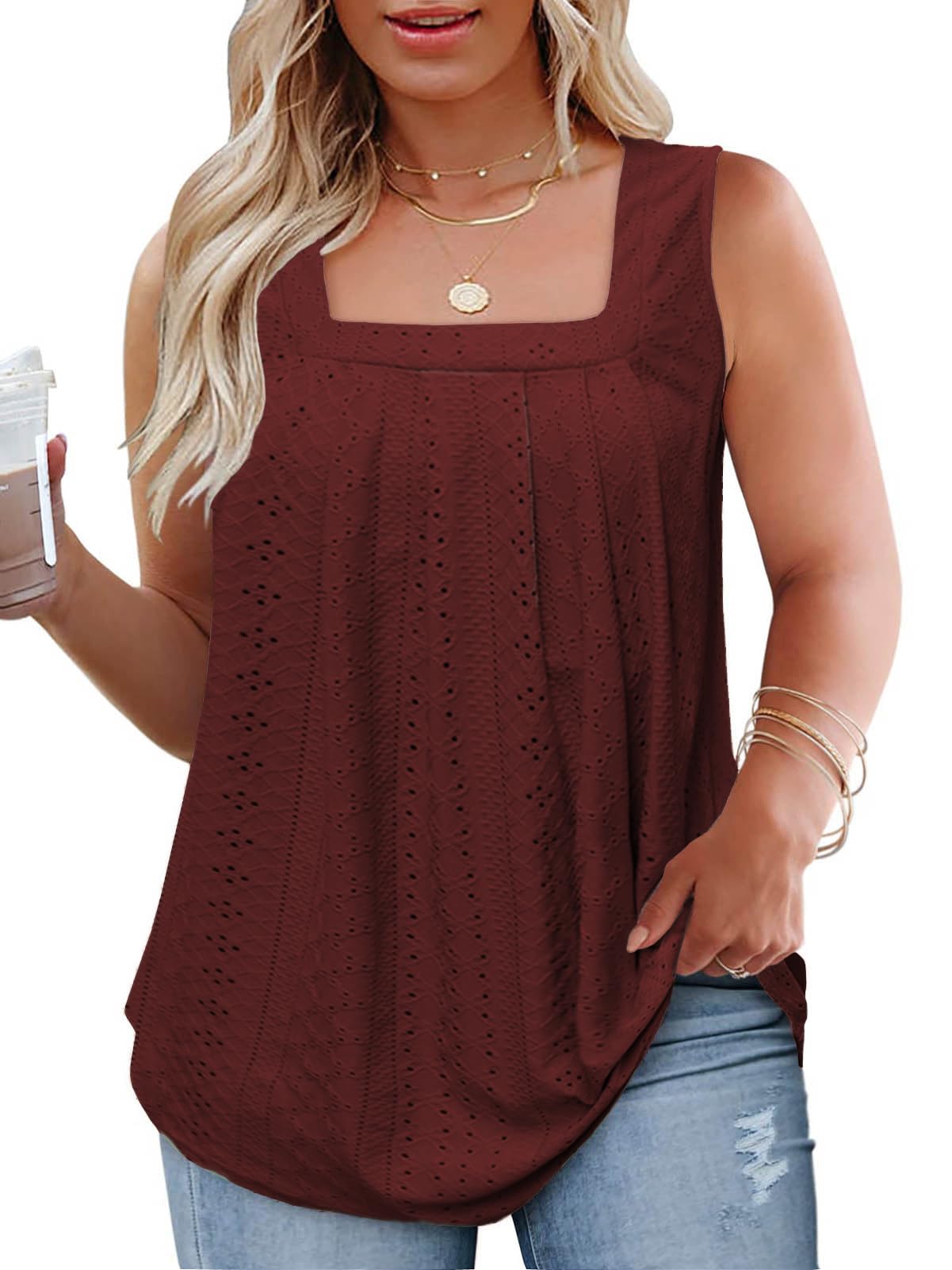 ROSRISS Plus-Size-Tank-Tops Summer Sleeveless Loose Fit Pleated Shirts Square Neck Tunics Eyelet Flowy Tees|Clothing