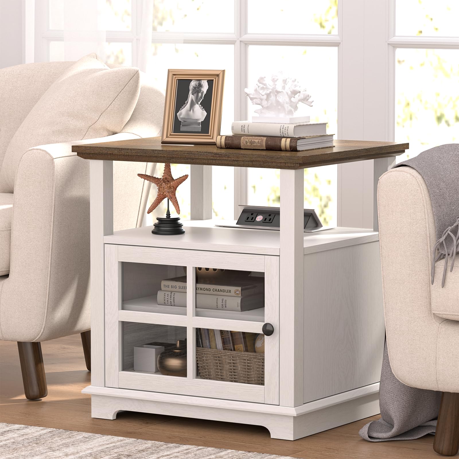 HIFYOBRO 24''Tall White End Table with Charging Station, Adjustable Shelf & Storage, 21" Large Side Table, Modern Farmhouse Nightstand for Bedroom,|Furniture