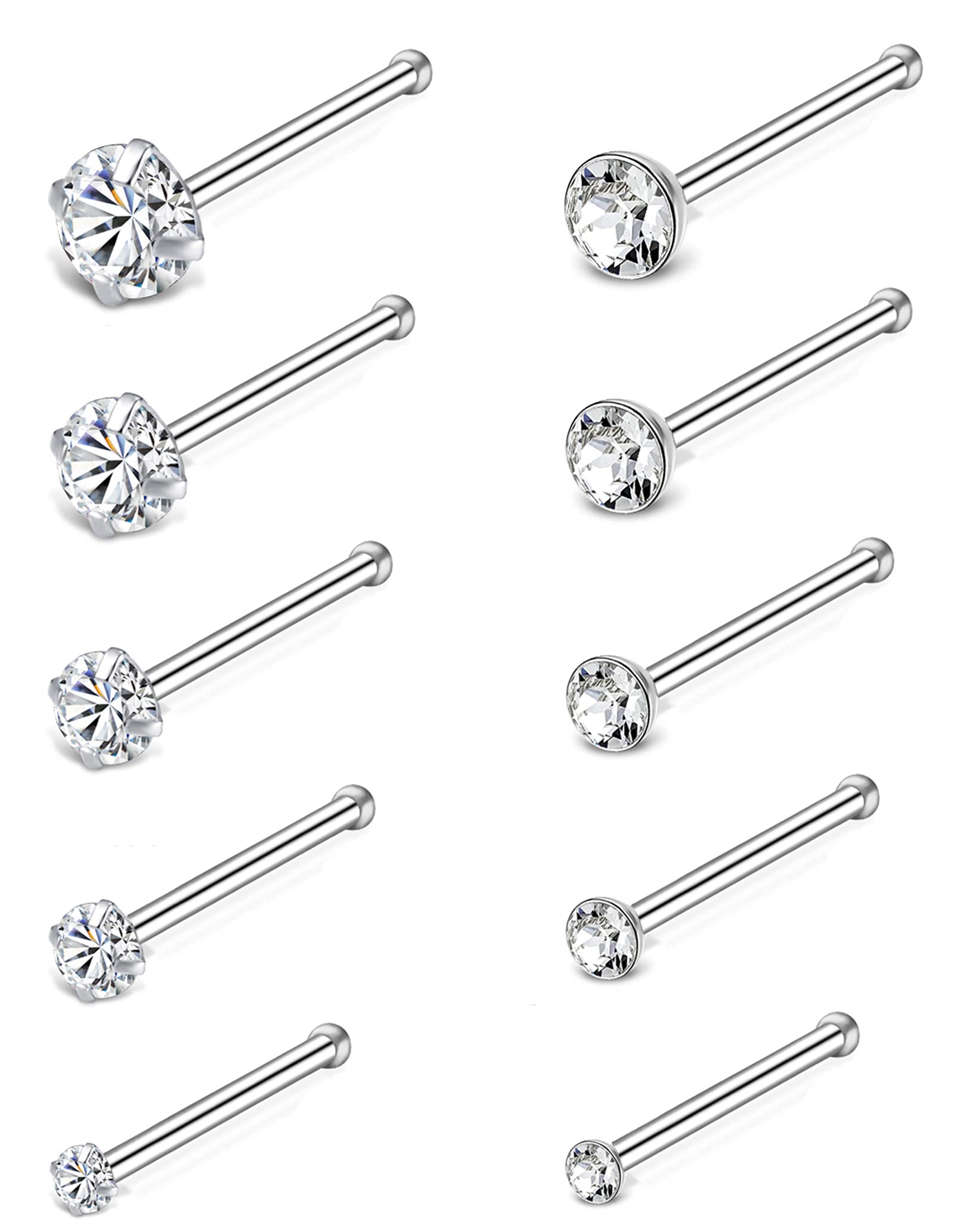 Tornito 20G 10Pcs Stainless Steel L Screw Bone Shaped Nose Studs Rings Square Round CZ Nose Ring Labret Nose Piercing Jewelry for Men Women Silver|Jewelry