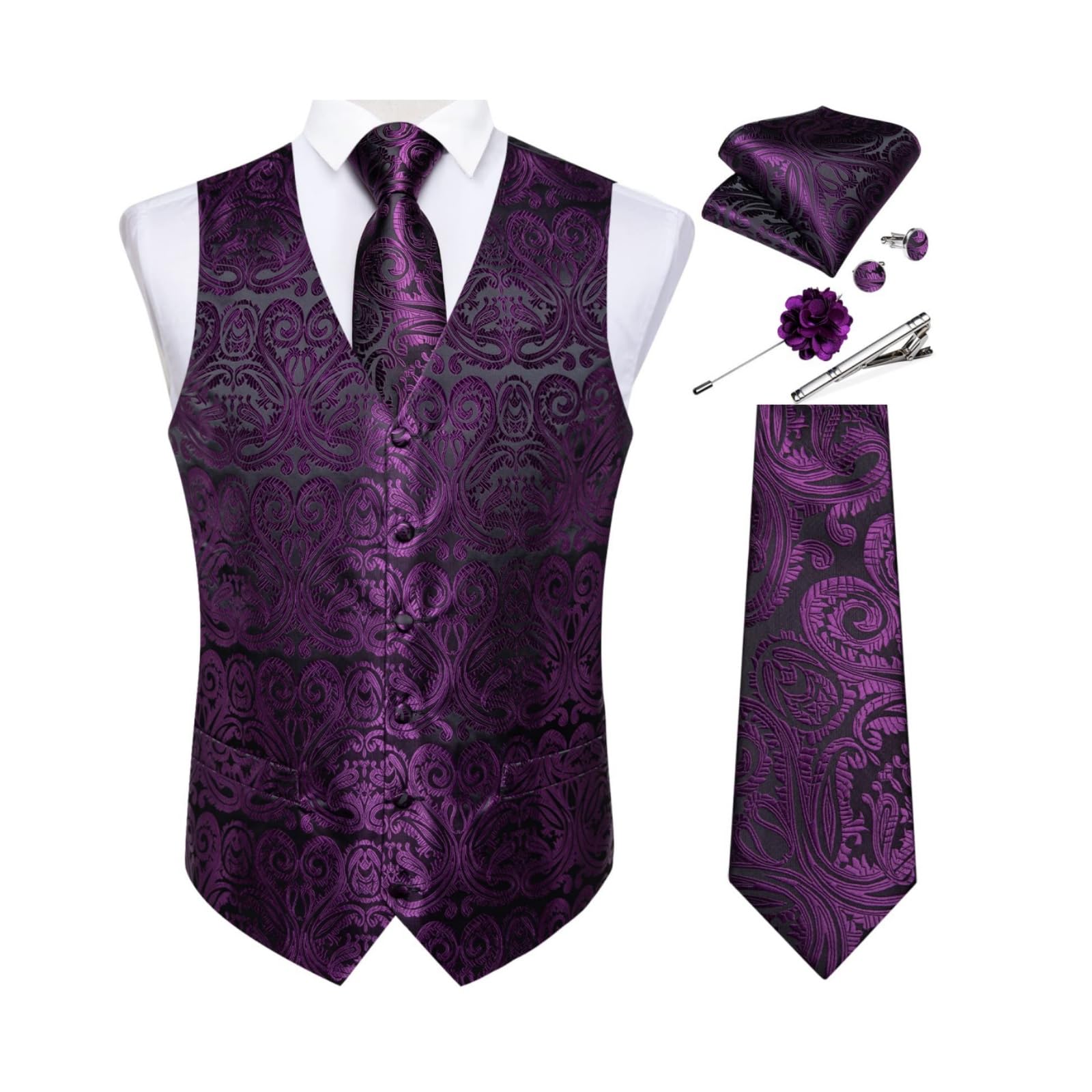 DiBanGu Mens Vest and Tie Set Formal Paisley Waistcoat and Necktie Pocket Square Cufflinks Silk Suit Vest for Tuxedo Wedding, Dark Purple, XX-Large|Clothing