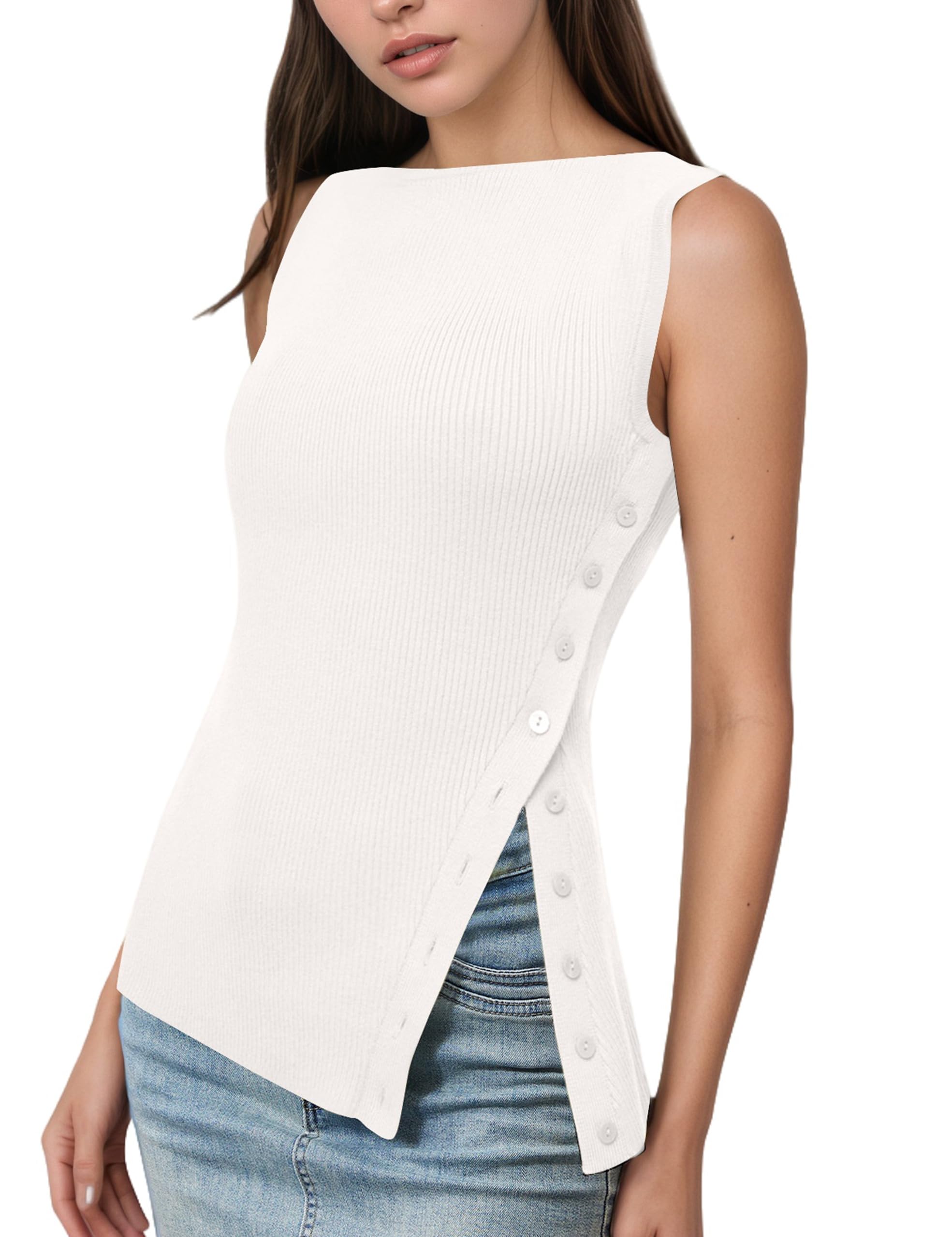 OLAPTA Women Asymmetrical Button Down Side Split Sleeveless Tank Tops Boat Neck Slim Fit Summer Casual Side Button Knit Vest|Clothing