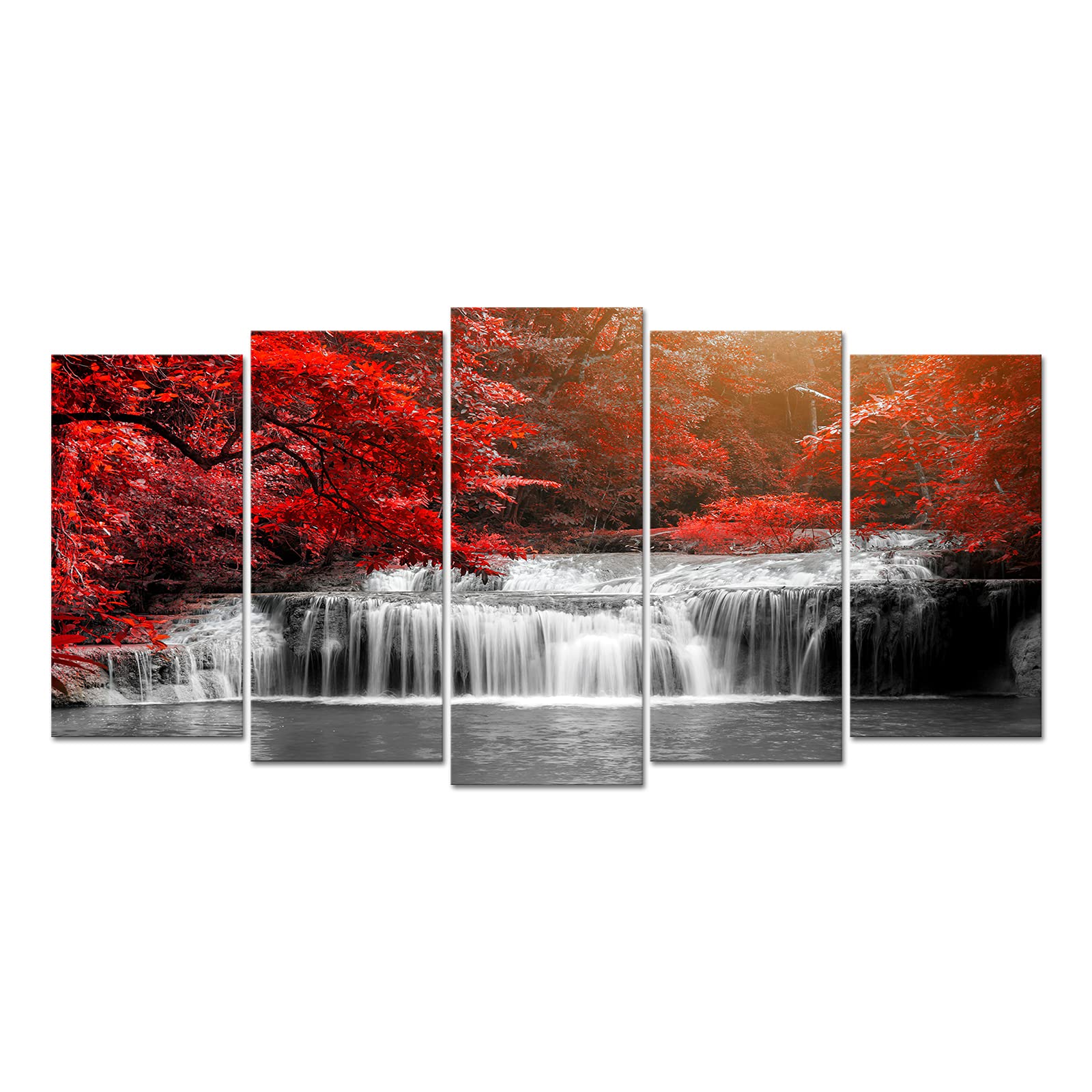 WELMECO Xlarge 5 Pieces Waterfall in Autumn Red Forest Canvas Wall Art Tree Nature Scenery Canvas Prints Gallery Wrapped Ready to Hang for Living Room|Home & Garden