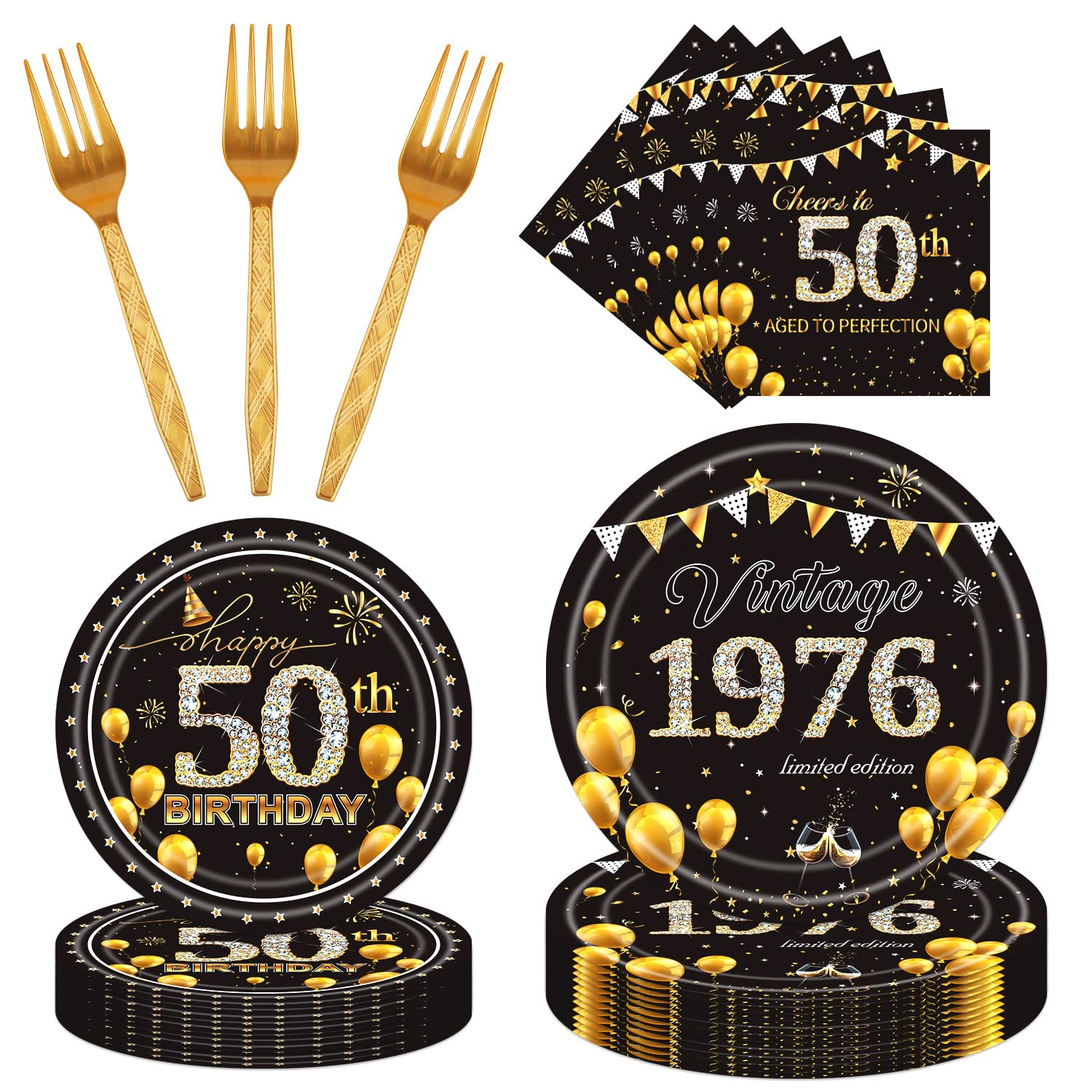 refavor 50th Party Tableware Set - 96PCS 50th 1976 Birthday Decorations Supplies Cheers to 50 Years, Paper Plate Napkin Fork Vintage Black Gold Bday|Kitchen & Dining
